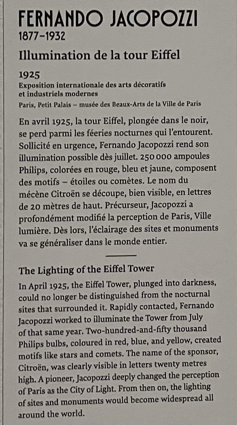 Plus de 200 photos de la Tour Eiffel illuminée par Fernand Jacopozzi ont été exposées, ainsi que son projet dessiné sur 3,30m de haut de l’éclairage de la Tour Eiffel pour l’exposition des arts décoratifs en 1925.
