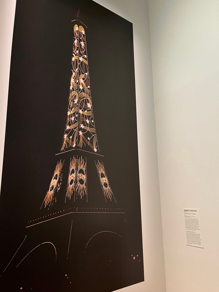 Plus de 200 photos de la Tour Eiffel illuminée par Fernand Jacopozzi ont été exposées, ainsi que son projet dessiné sur 3,30m de haut de l’éclairage de la Tour Eiffel pour l’exposition des arts décoratifs en 1925.